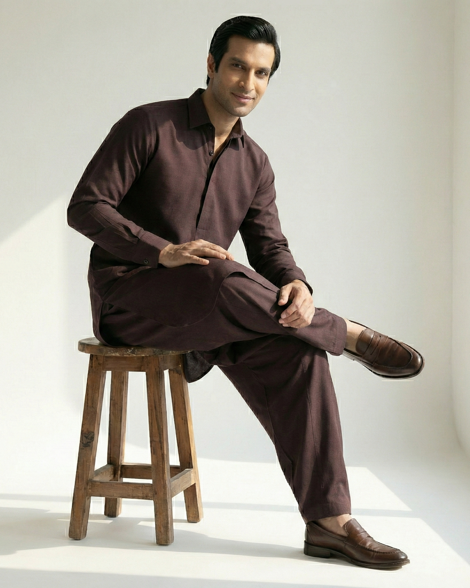 • Man wearing a brown kurta with pants in a minimalistic setting