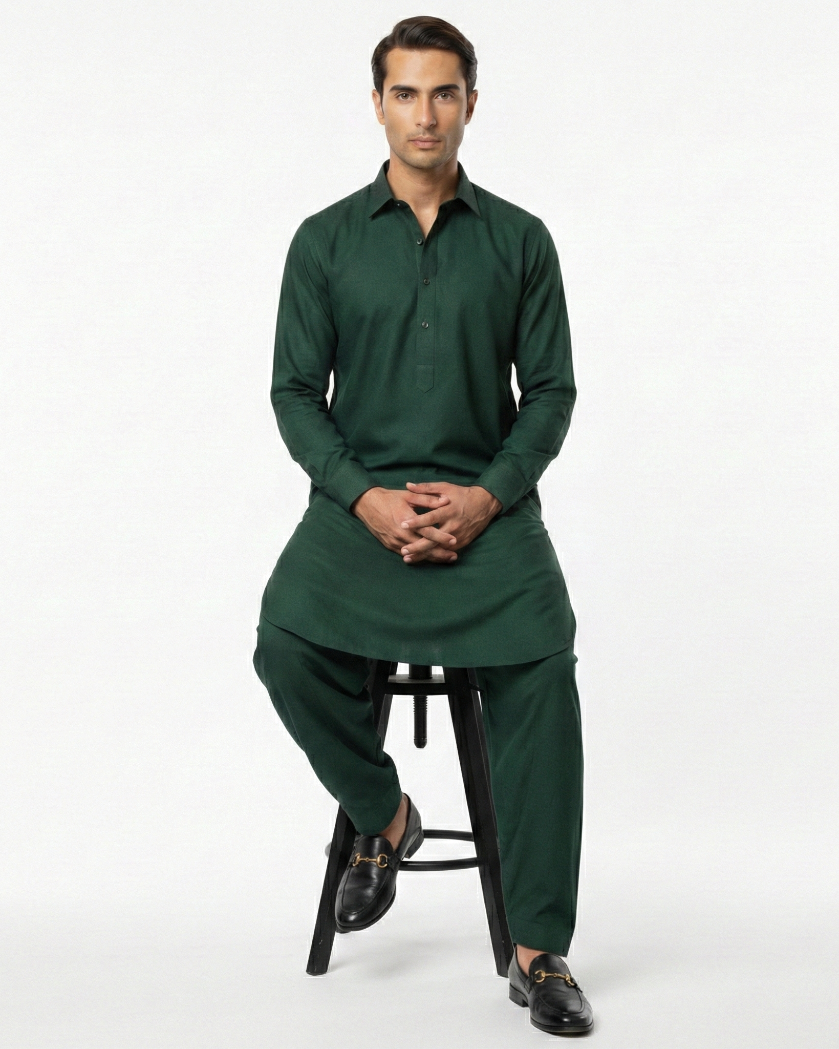 • Man wearing a dark green traditional outfit sitting on a stool against a white background
