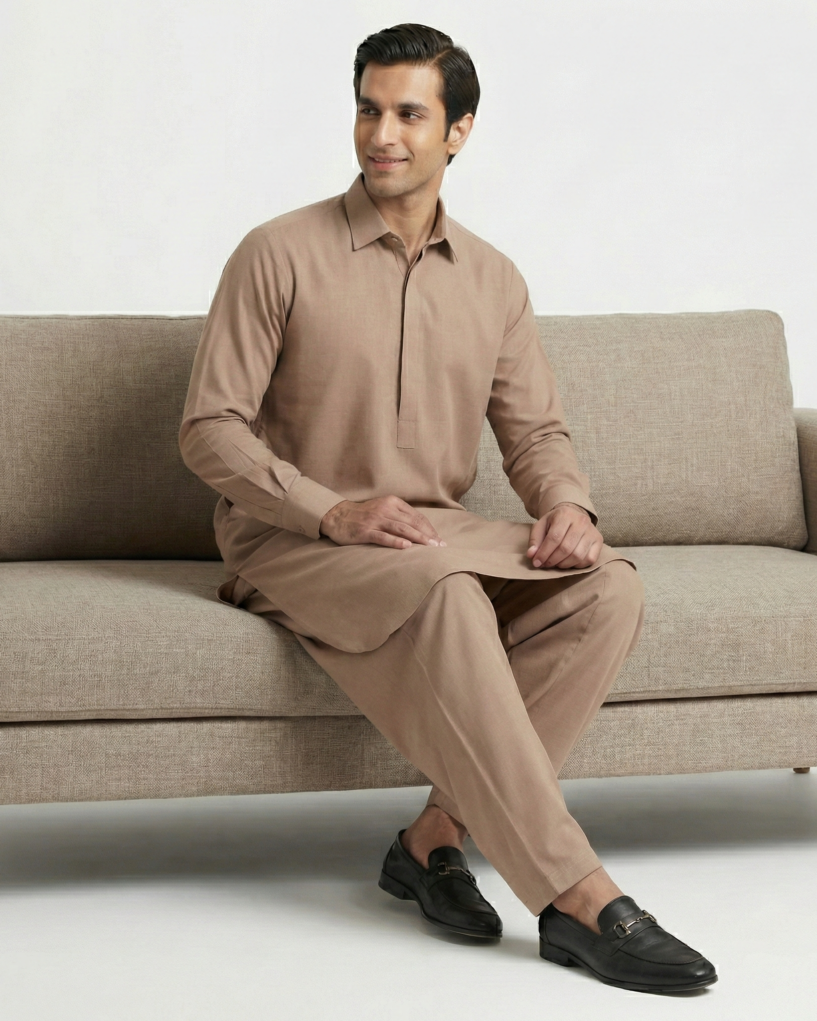 • Man sitting on a beige sofa wearing a beige traditional outfit.