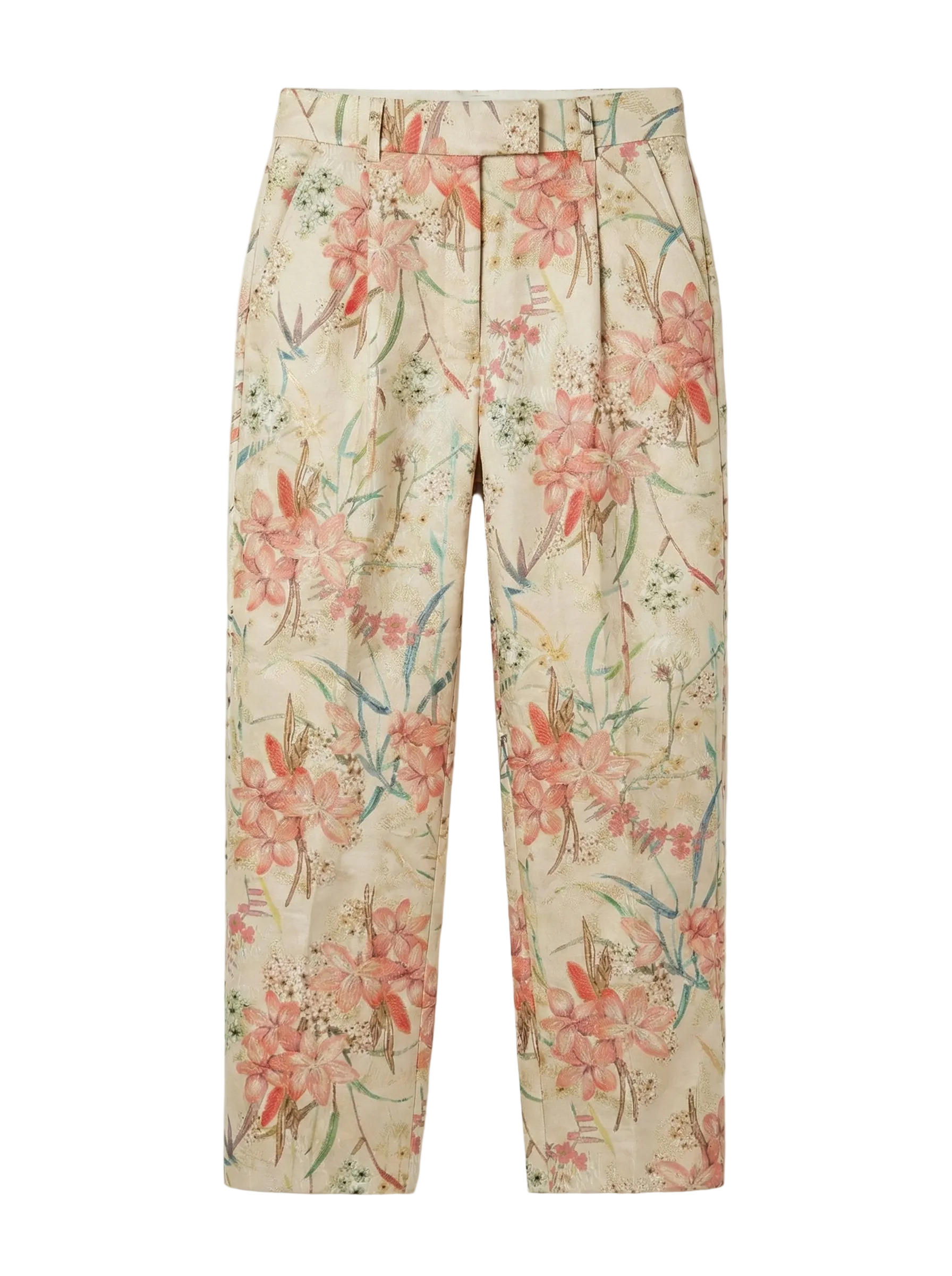 Elevate your wardrobe with the Ophelia Wide-Leg Trouser, a statement piece that masterfully blends relaxed tailoring with heirloom-quality luxury. Crafted from exquisite floral brocade silk, these trousers feature a champagne-beige canvas brought to life with an intricate botanical motif in soft coral, blush pink, and verdant greens. Designed for the modern sophisticate, they offer a fluid, floor-grazing silhouette that moves with effortless grace.