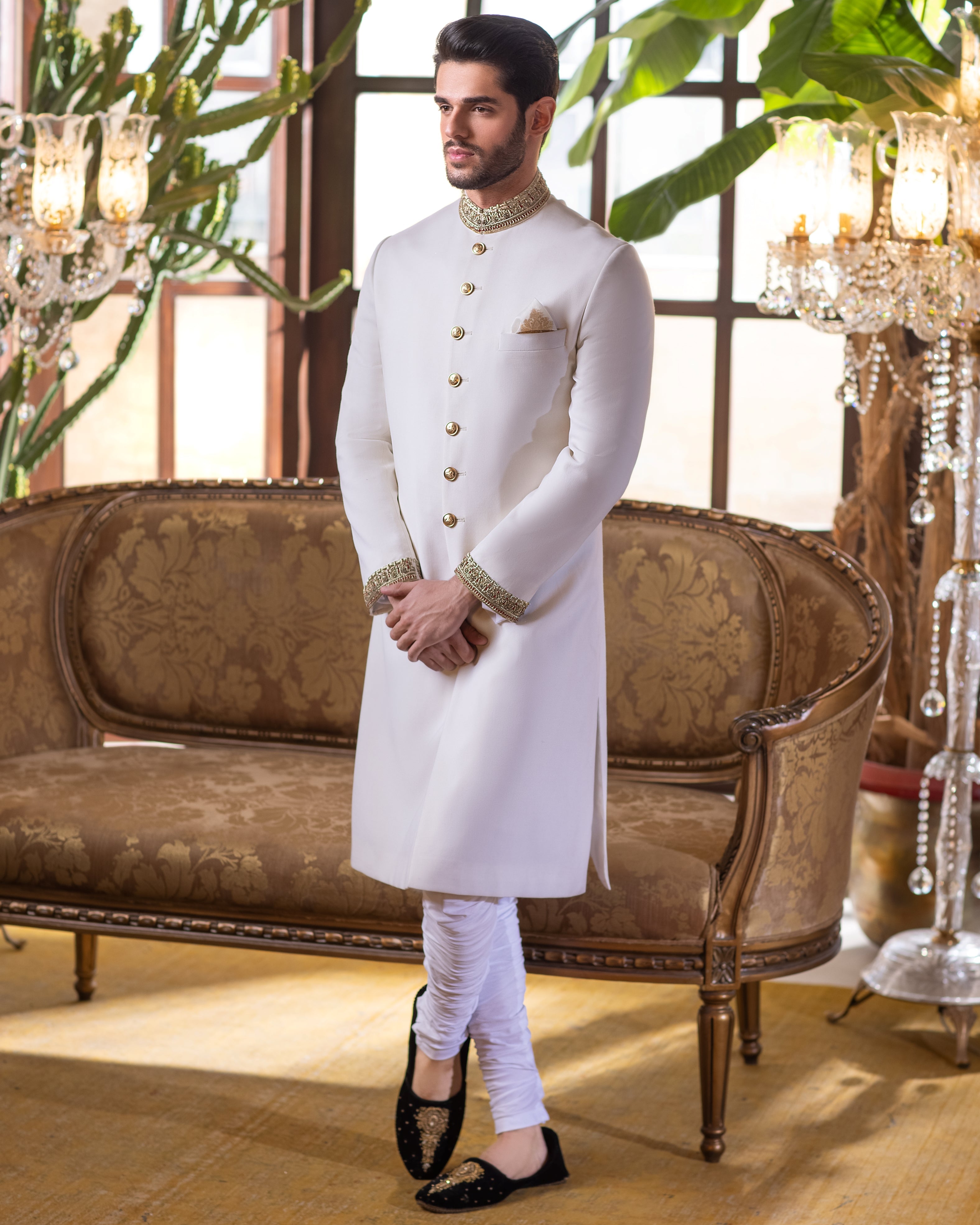 - Metallic Buttons: Elegant metallic buttons enhance the sherwani’s refined and modern appeal.