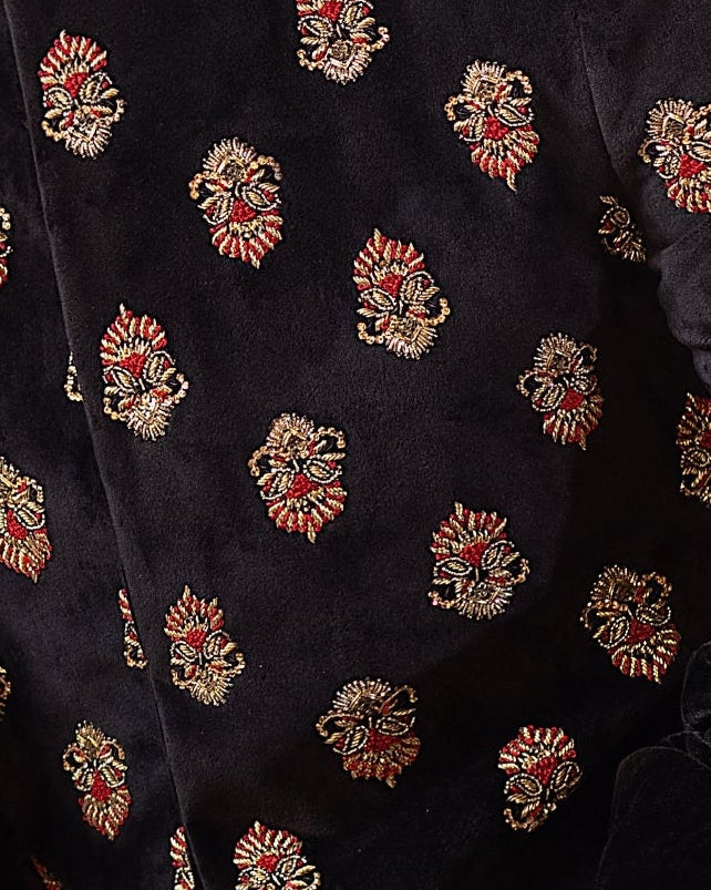 Introducing our opulent Black Velvet Sherwani, a masterpiece of intricate craftsmanship and regal sophistication. Crafted from plush black velvet, this sherwani is adorned with exquisite hand-embroidered motifs, featuring detailed thread and dabka work that adds depth and grandeur to its timeless appeal.