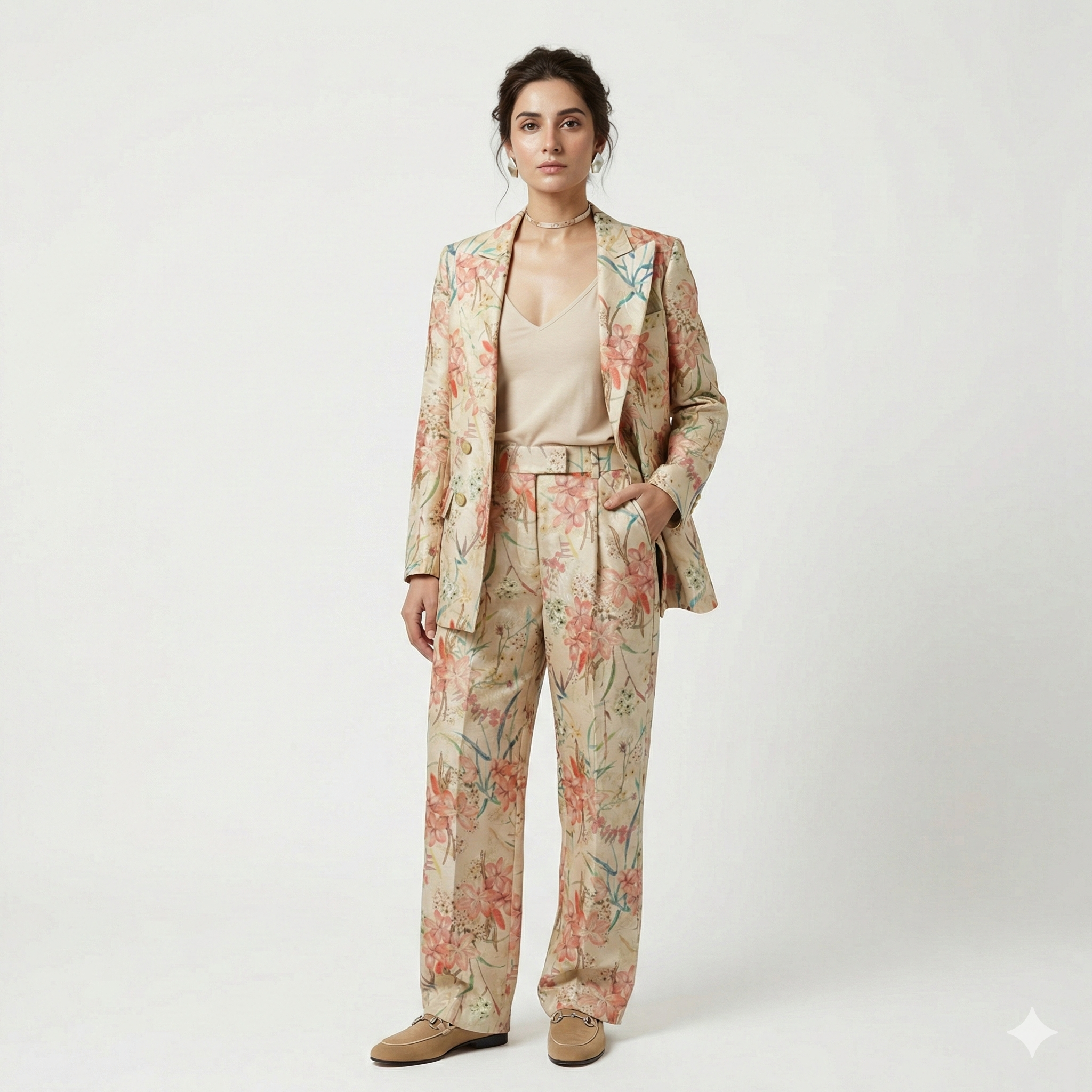 • Woman wearing a floral suit on a white background