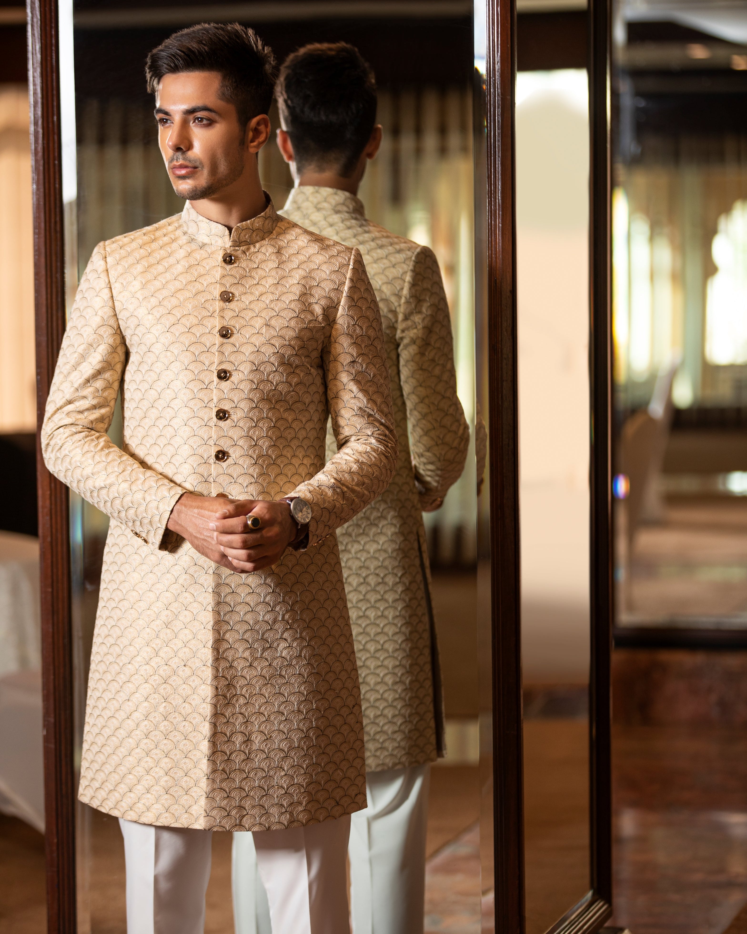 Elevate your occasion wear with the Beige & Gold Scalloped Embroidered Sherwani—a masterpiece that blends heritage with modern luxury.