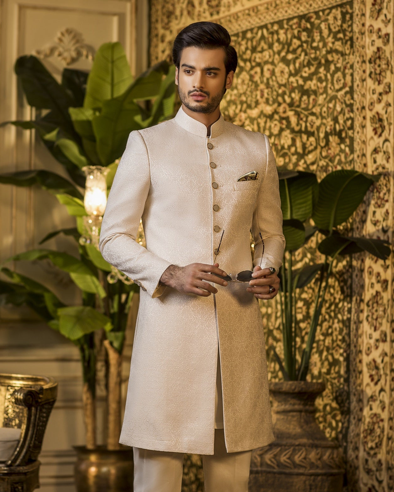 Elevate your traditional attire with our classic sherwani in ivory karandi jamiawar — a masterpiece where timeless heritage meets modern sophistication. Designed for the discerning gentleman, this sherwani is meticulously crafted with intricate embroidery that captures the essence of cultural elegance. The luxurious fabric, chosen for its refined texture and comfort, flows gracefully to create a silhouette that is both regal and contemporary.